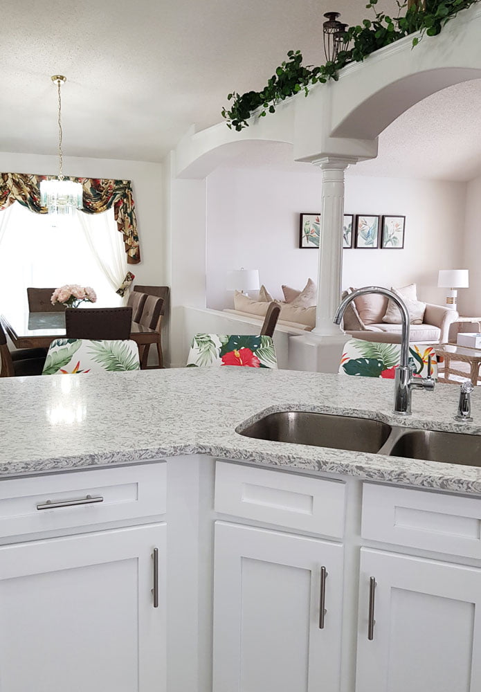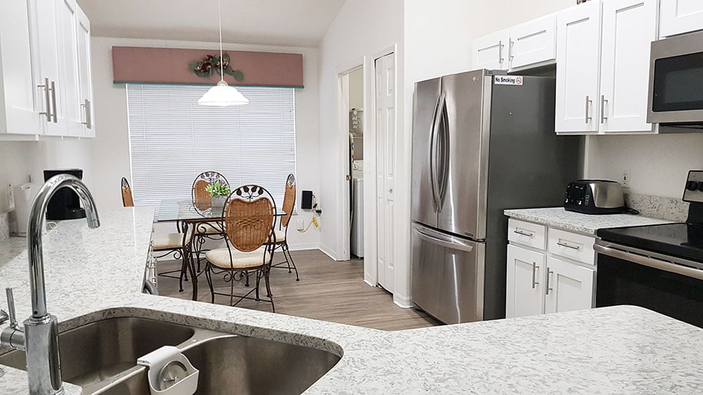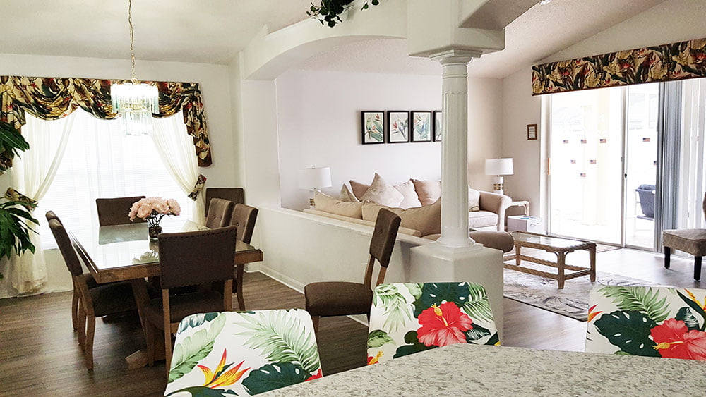 The open plan lounge and additional dining area provides ample space for the recommended maximum occupancy of eight guests. Comfortable seating and tasteful décor provides a relaxing ambience after a hectic day at the theme parks. A ROKU Smart TV provides a range of channels and also includes apps including Netflix and YouTube that allow guests to sign in with a number of their own personal subscriptions or use a Firestick. Complimentary wifi is available throughout Villa Delmar making it easy to keep in touch with friends and family through email, Whatsapp and Facebook. For free local calls there are telephones located in the kitchen and master bedroom.